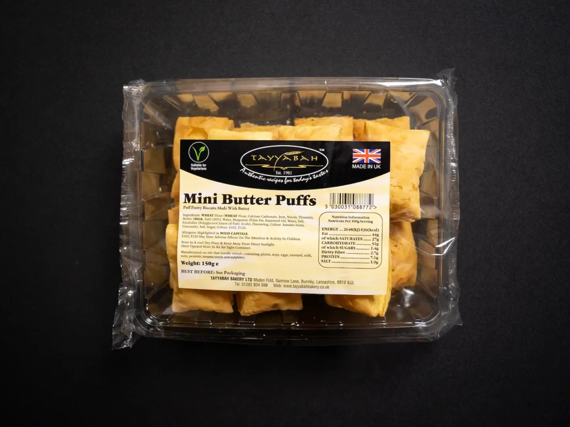 Wheat Flour (Wheat Flour, Calcium Carbonate, Iron, Niacin, Thiamin), Butter (30%) (Milk, Salt), Water, Margarine (Vegetable Oils (Palm, Rapeseed, Sunflower)), Water, Salt, Emulsifier: Polyglycerol Esters, Flavourings, Colour: Annatto Bixin, Curcumin), Water Salt, Sugar, Colour: Sunset Yellow.